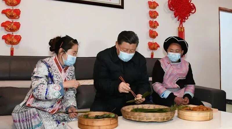 △2021年2月3日,习近平在贵州毕节市黔西县新仁苗族乡化屋村苗族村民赵玉学家,同赵玉学一家边聊家常边制作当地传统节日食品黄粑。