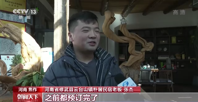 河南省修武县云台山镇朴居民宿老板 张杰:元旦期间房间都是基本上十到十五天之前都预订完了,咱这边离郑州、新乡比较近,都是回头客预订。