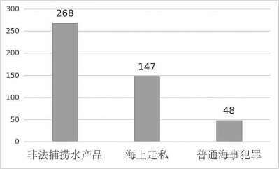 涉及面较广,但发案事由和犯罪对象相对比较集中。从案件类型看,既有危害海洋环境资源类犯罪,如非法捕捞、非法采矿等;也有破坏国家对货物、人员进出境监管秩序类犯罪,如海上走私、海上偷渡等;还有危害航运安全、船上人身财产安全类犯罪,如海上交通肇事、重大责任事故等。但整体而言,以非法捕捞水产品和海上走私犯罪为主,近五年共审结这两类案件415件,占比89.6%。犯罪对象也比较集中,例如海上走私案件货物主要为成品油、白糖、冻品。