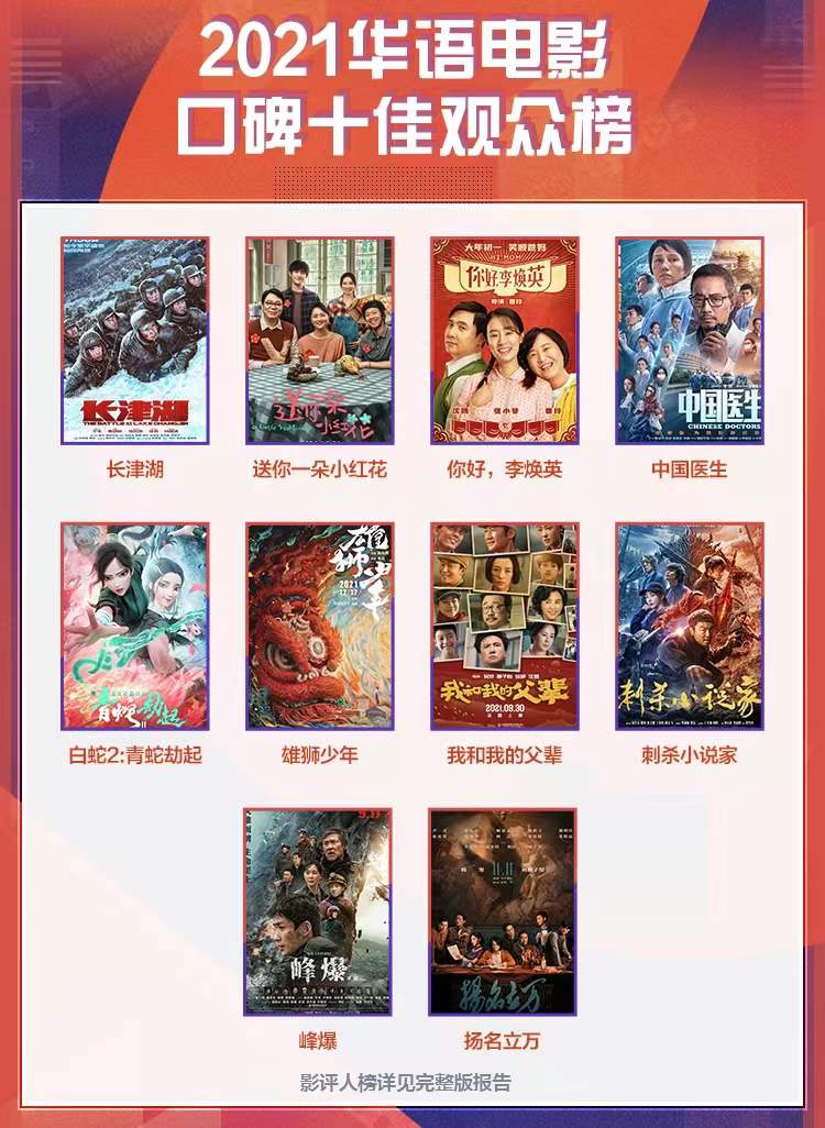 1905电影网、电影频道融媒体中心邀请数百位专业影评人、数万普通网友,进行了2021华语电影口碑十佳的票选活动。《长津湖》《悬崖之上》《你好,李焕英》等优秀国产片,赢得了业内外观众的一致认可。口碑与票房表现成正比。