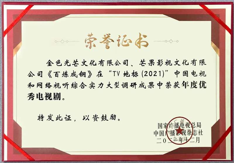 中国青年报客户端讯(中青报•中青网记者 吴晓东)由国家广电总局《中国广播影视》杂志社主办的“TV地标(2021)”中国电视和网络视听综合实力大型调研榜单近日公布,由金色光芒、芒果影视摄制出品由金色光芒、芒果影视摄制出品的电视剧《百炼成钢》获评“年度优秀电视剧”。