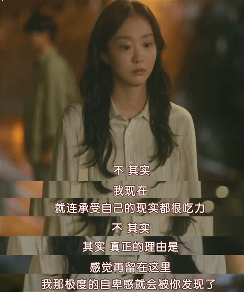 所以,看似没有预兆地,国延秀提出了分手。面对崔雄的质问“所以,我们不得不分手的理由是”,她没有正面回答,只在内心独白里告诉观众答案:“因为你和我面对的现实不同,不,其实是因为我现在连我的现实生活都难以承受,不,其实真正的理由是,我怕再交往下去,我那强烈的自卑感会被你看透。”