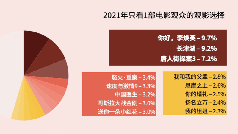 据猫眼研究院统计,2021年全国人均观影数量回升至2.4部,半数观众一年仍只看一部电影。这些观众全年唯一的一张电影票23%贡献给了春节档,13%贡献给了国庆档。他们所选择的影片前三名分别是《你好,李焕英》(9.7%),《长津湖》(9.2%)和《唐人街探案3》(7.2%)。