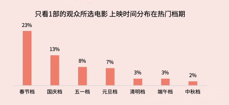 猫眼研究院分析师刘振飞认为,这些数据组合出了这样一个情境——“选择在一个热门档期,一年观看一部热门电影”。“这一定不是行业愿意看到的,但如果热门影片只愿意在热门档期上映,那么久而久之,观众也只会在热门档期,只选择最热门的一部观看。需求端消费行为的改变,很多是由于供给端的培养。”