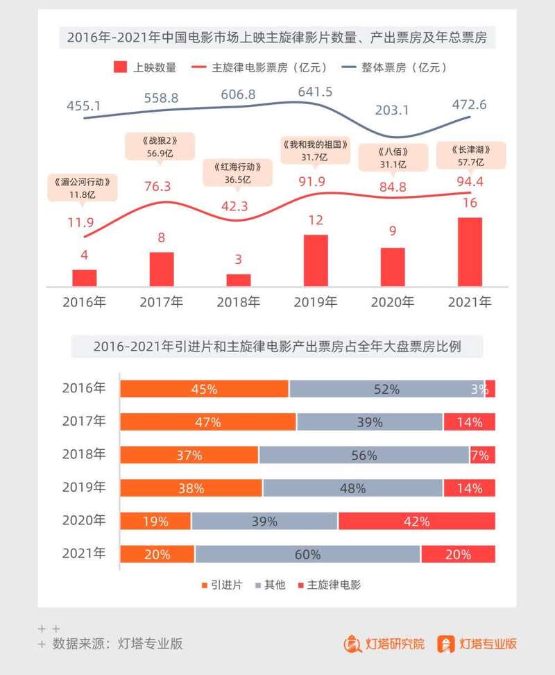 在内容市场方面,“中国叙事”成为过去一年的核心主题。据灯塔专业版数据,2021年的进口片票房在大盘中占比20%,不到2016年占比的一半,由主旋律题材引领的国产电影,继续在这一年获得稳定发展。其中,电影《长津湖》以57.7亿元票房打破影史纪录,影片在创作上持续贴近时代精神,也延续了“中国叙事”。