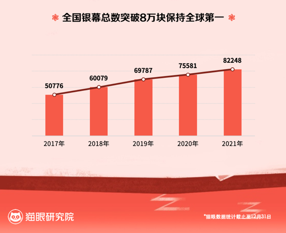 2021年,中国电影总票房达到472.58亿元,恢复至疫情前的74%,全年总票房和银幕总数继续保持全球第一。其中,年度票房前三名为《长津湖》《你好,李焕英》《唐人街探案3》,三者总票房突破150亿元。去年也诞生了历史最高春节档(78.4亿元)和历史第二高国庆档(43.9亿元)的成绩,两大档期合计在全年大盘的票房占比已逐年提升至四分之一的水平。