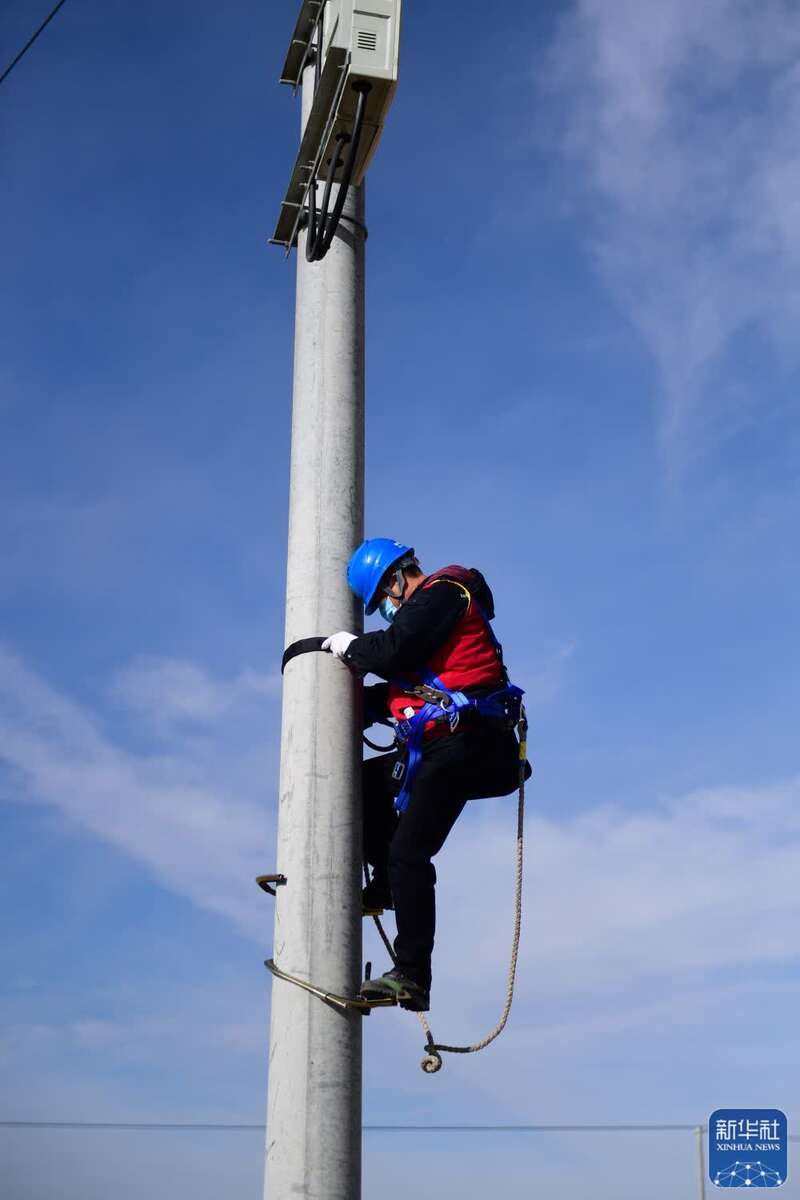 屋外,国网青海电力公司共产党员服务队的李文科穿戴好脚扣,爬上电线杆,检查配电箱里导线连接情况。