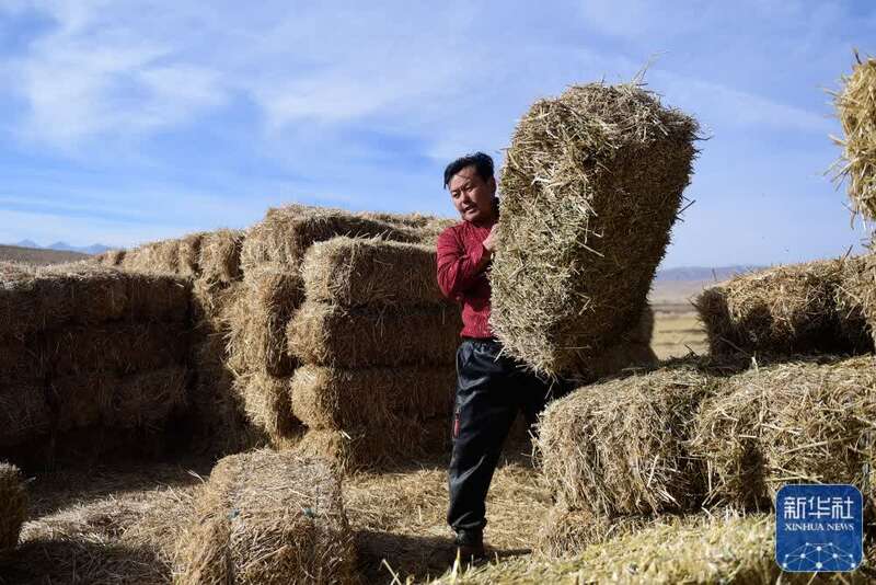 1月9日,在青海省海北藏族自治州门源回族自治县皇城蒙古族乡马营村,牧民准备牧草喂羊。新华社记者 张龙 摄