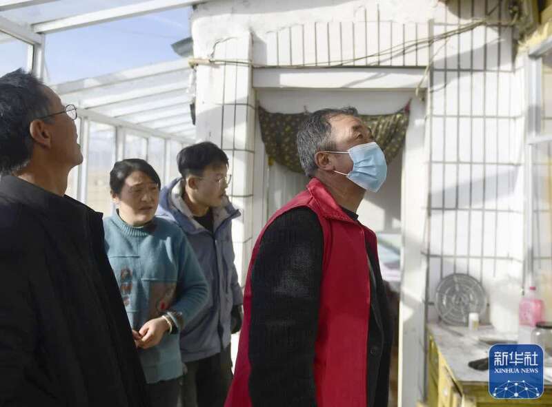 1月9日,在青海省海北藏族自治州门源回族自治县皇城蒙古族乡马营村,村党支部书记万玛才让(右一)在村民家中排查住房安全隐患。新华社记者 张龙 摄