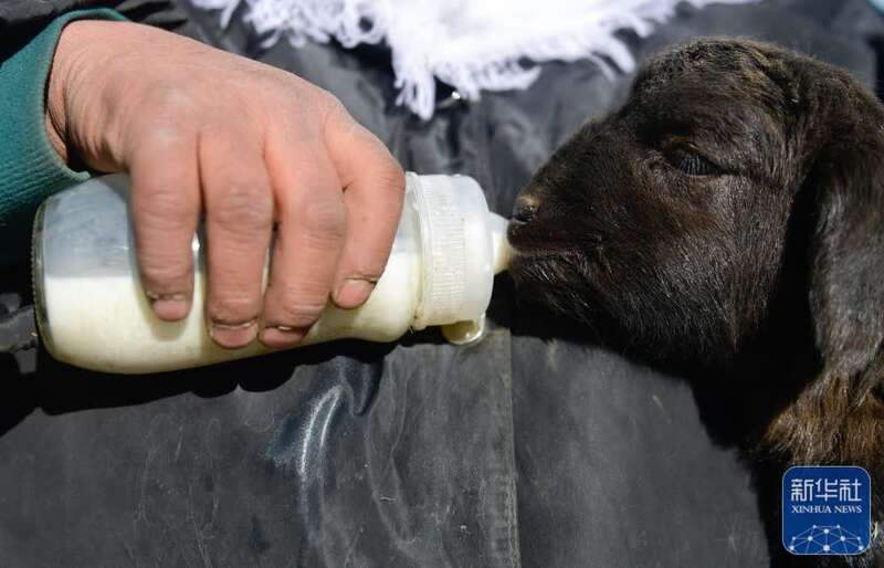 1月10日,在青海省海北藏族自治州门源回族自治县皇城蒙古族乡马营村,牧民给羊羔喂奶。新华社记者 张龙 摄