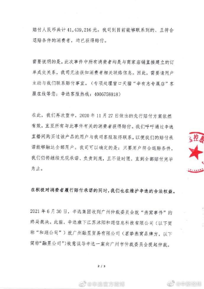 辛选集团就辛巴燕窝事件致歉:已向消费者赔付超4143万