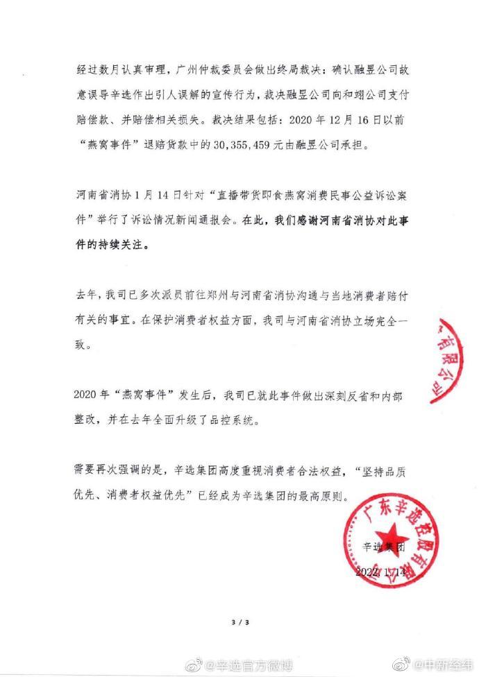 1月14日,辛选集团官博发文称,已注意到今日河南省消协对“辛巴直播带货即食燕窝消费民事公益诉讼案件”举行诉讼情况新闻通报会,并再次就2020年10月的“燕窝事件”向消费者致歉。