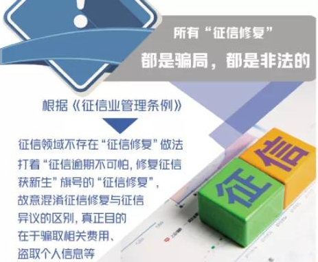 “毫无疑问,所有‘征信修复’都是骗局,都是非法的。”招联金融首席研究员董希淼表示,根据《征信业管理条例》,征信领域不存在“征信修复”做法。那些打着“征信逾期不可怕,修复征信获新生”旗号的“征信修复”,故意混淆征信修复与征信异议的区别,真正目的在于骗取相关费用、盗取个人信息等。