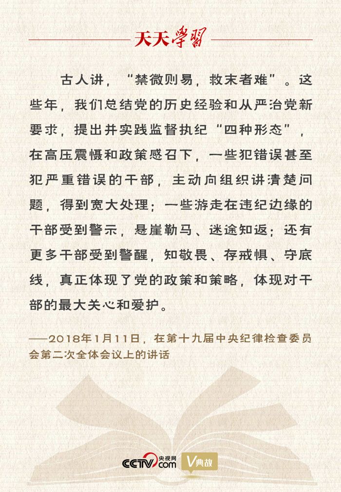 2014年1月14日,在十八届中央纪委三次全会上,习近平总书记强调:“要抓早抓小,有病就马上治,发现问题就及时处理,不能养痈遗患。”