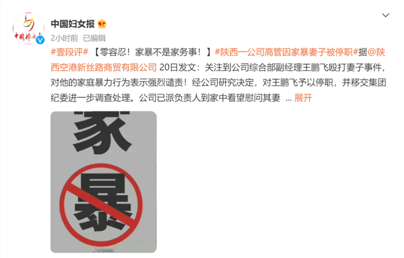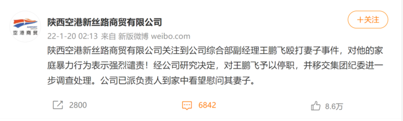 陕西空港新丝路商贸有限公司关注到公司综合部副经理王鹏飞殴打妻子事件,对他的家庭暴力行为表示强烈谴责!经公司研究决定,对王鹏飞予以停职,并移交集团纪委进一步调查处理。公司已派负责人到家中看望慰问其妻子。