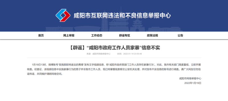 咸阳市网络举报中心发布辟谣信息称,“咸阳市政府工作人员家暴”信息不实。