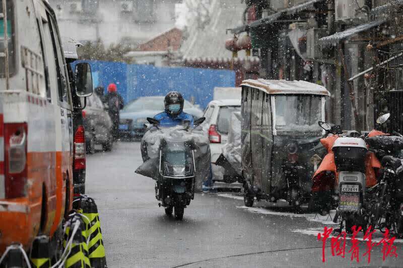 1月20日,北京前门胡同,外卖员冒雪给客人送餐。中青报·中青网记者 李建泉/摄