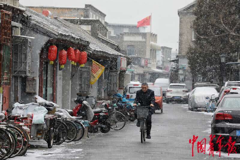 1月20人,北京前门胡同,雪中的骑行人。中青报·中青网记者 李建泉/摄