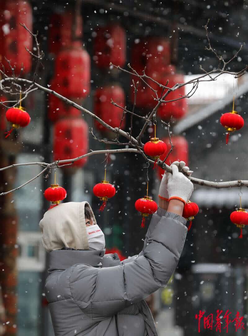 1月20日,北京前门大街,工作人员冒雪在树上挂上红灯笼。当天,北京迎来2022年第一场降雪。中青报·中青网记者 李建泉/摄