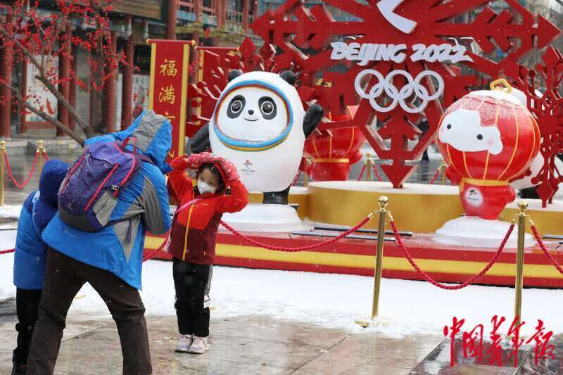 1月20日,北京前门大街,一名小朋友在冬奥吉祥物前拍照。中青报·中青网记者 李建泉/摄