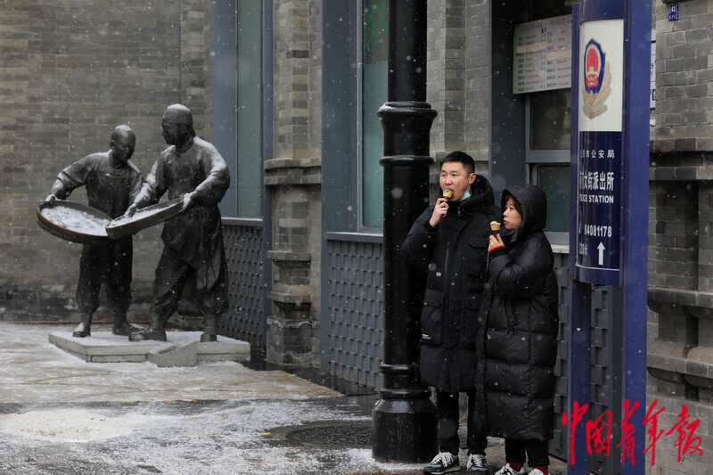 1月20日,北京前门大街,一对年轻人在雪天中吃冰激凌。中青报·中青网记者 李建泉/摄