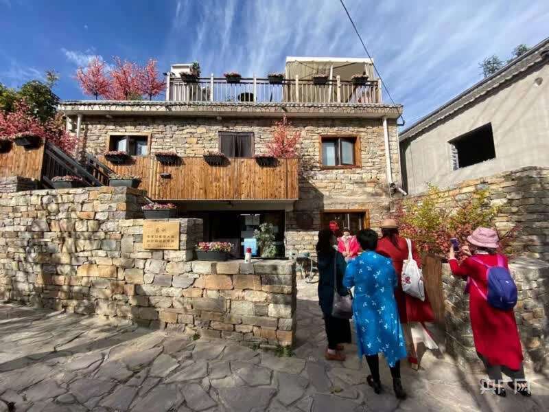 游客们在西井峪一民宿前拍照留念(央广网记者 褚夫晴 摄)
