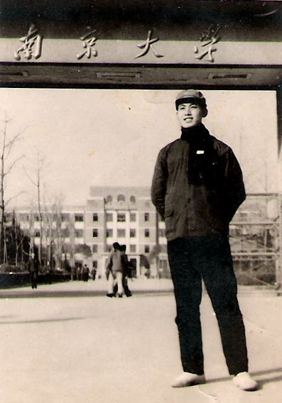火车到了南京火车站,南京大学有专车把我们接到学校。到了学校,只见红旗招展锣鼓喧天,欢迎新同学的横幅格外醒目。我看见校门口有照相馆设摊照相,我也花了一毛钱照了一张黑白照片留作纪念。