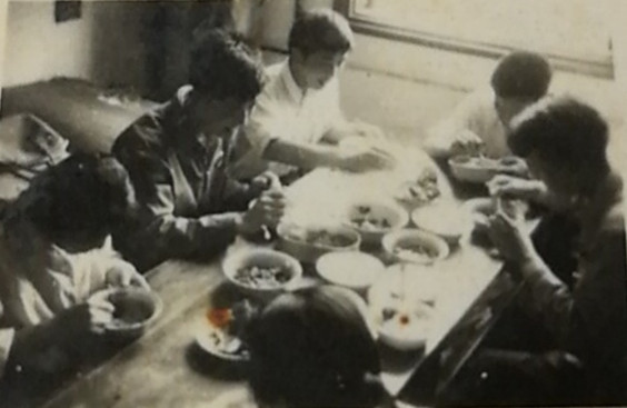 这张照片是我的高中同学来看我,中午我们从食堂里把饭菜打来,大家聚在一起吃饭的情景。左边中间的是我,左边靠窗的男生和右边的男生是我上海一起考进南大的同学,分别在天文系和数学系。还有三位同学是我们班里的同学。南大食堂饭菜很便宜,我们大家吃得很开心,边吃边聊。
