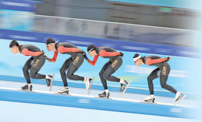 1月29日,中国速度滑冰队运动员在训练中。