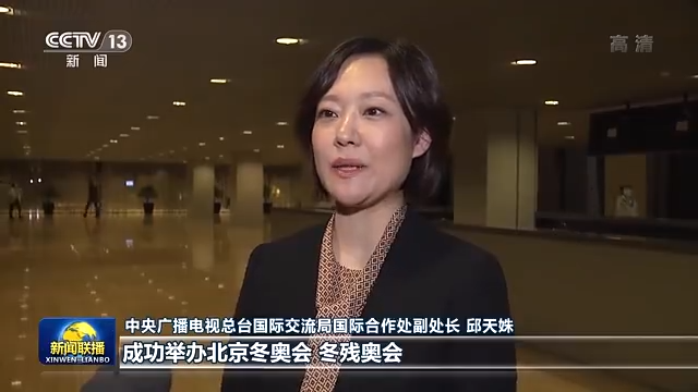 中央广播电视总台国际交流局国际合作处副处长 邱天姝:总书记指出,成功举办北京冬奥会、冬残奥会,有利于展示我们国家和民族致力于推动构建人类命运共同体,阳光、富强、开放的良好形象,增进各国人民对中国的了解和认识。我们一定要以北京冬奥会为契机,助力加强中外体育交流,为推动东西文明交融,展示中国良好形象作出自己应有的贡献。