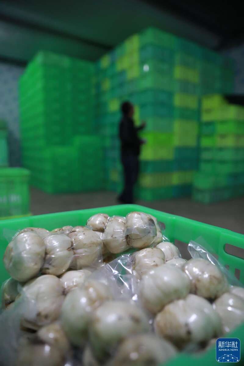 ↑在兰州市七里河区西果园镇袁家湾村百合加工车间,村民许海燕将分拣完成的百合进行包装(1月26日摄)。