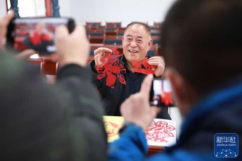 ↑在兰州市七里河区西果园镇袁家湾村村民活动中心,村民袁正春展示自己剪的窗花(1月26日摄)。