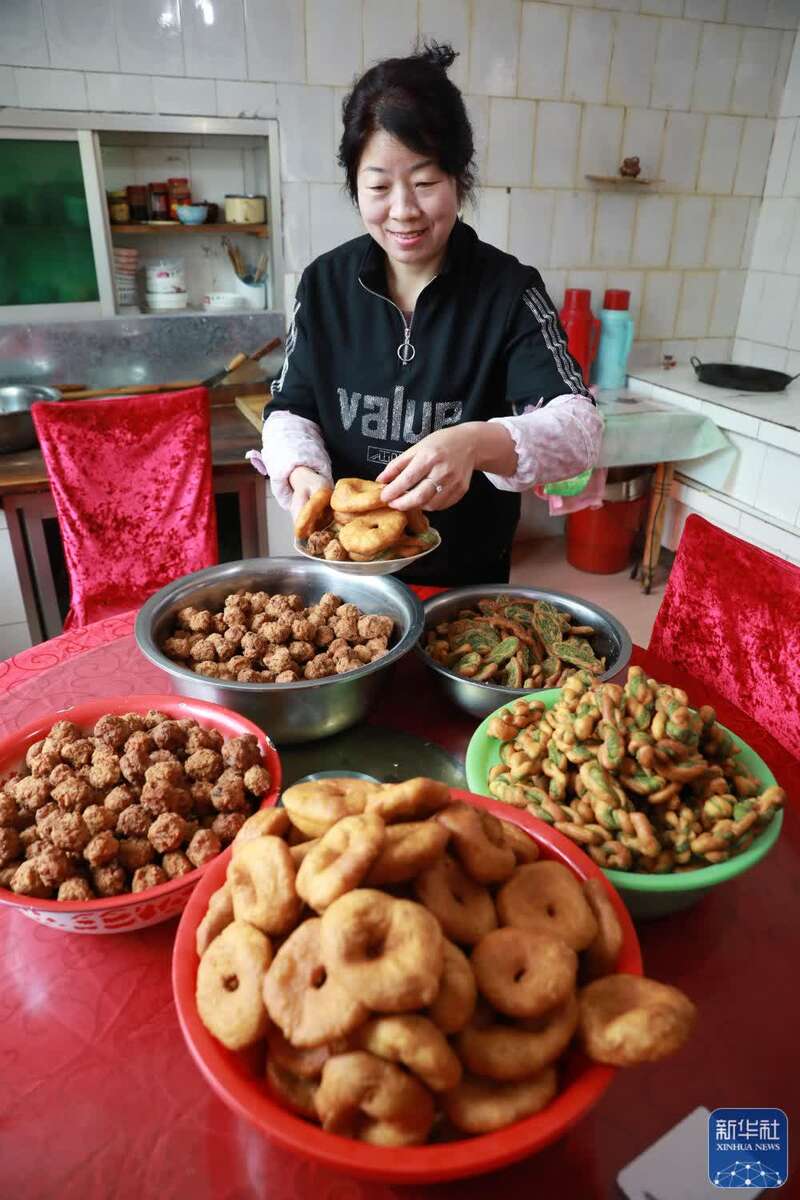 ↑在兰州市七里河区西果园镇袁家湾村,村民张军兰在家中炸油饼、炸丸子(1月26日摄)。