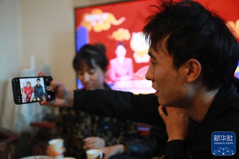 ↑在兰州市七里河区西果园镇袁家湾村,村民张波(右)在家中给爷爷奶奶拍照(1月31日摄)。