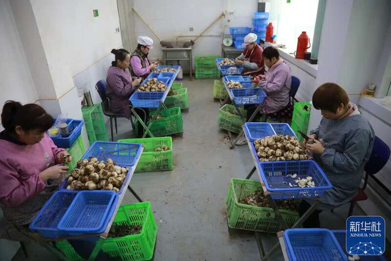↑在兰州市七里河区西果园镇袁家湾村百合加工车间,村民在分拣百合(1月26日摄)。