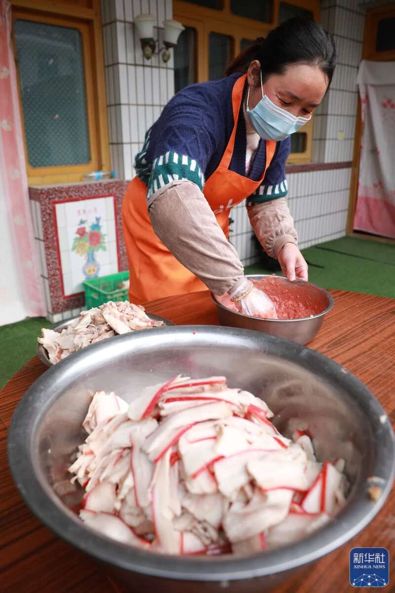 ↑在兰州市七里河区西果园镇袁家湾村,村民沈明霞在家中制作“兰州糟肉”(1月26日摄)。