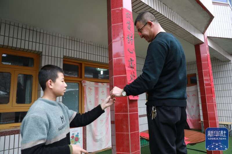 ↑在兰州市七里河区西果园镇袁家湾村,村民马明祯(右)和儿子在家中一起贴春联(1月26日摄)。