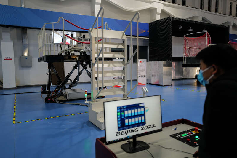 起初用于航天领域的技术也支持了冰雪项目的训练。在二七基地,一系列六自由度训练系统,通过六自由度平台还原人们上下、左右、旋转等日常运动中的状态,并同步视频画面模拟出钢架雪车、雪车、雪橇、高山滑雪、越野滑雪等项目的真实赛场环境,帮助运动员们提前将赛道信息牢记于心,并形成肌肉记忆。