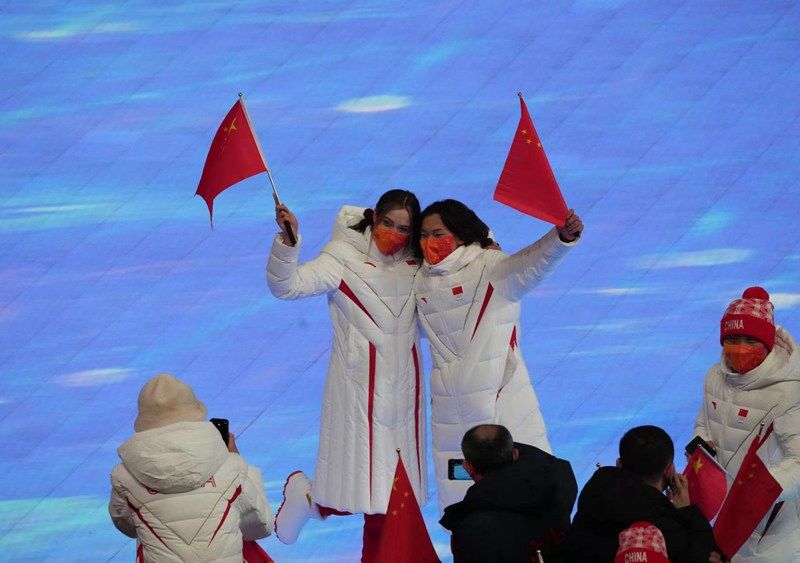中国青年报客户端北京2月20日电(中青报·中青网记者 胡春艳 杨杰 王鑫昕)踏着经典乐曲《欢乐颂》,各代表团运动员在观众的掌声和欢呼声中入场。中国代表队中,年轻的金牌得主谷爱凌、苏翊鸣一同进场,两人挥舞着国旗,脸上溢满笑容。