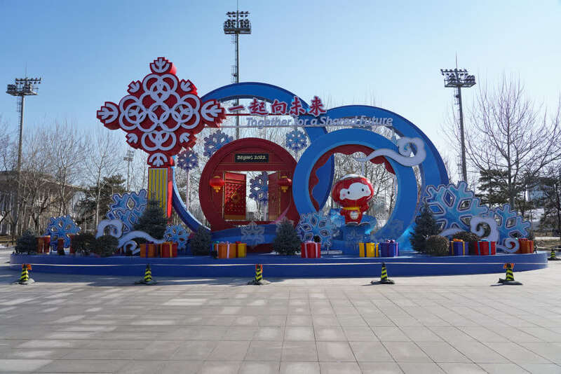 ↑2月24日,工作人员在奥林匹克公园公共区布置北京冬残奥会吉祥物“雪容融”景观。