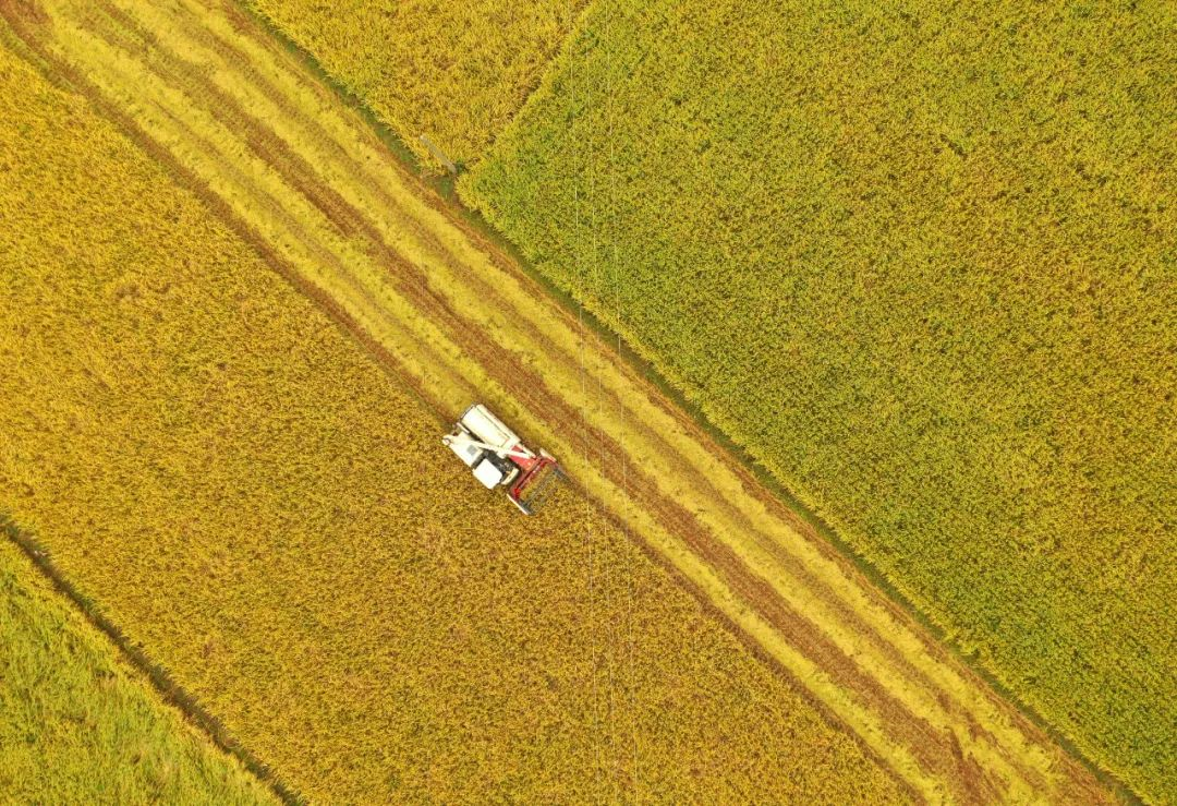 2021年10月13日,在湖南省衡阳市衡阳县台源镇九市村,当地村民驾驶农机在收割晚稻(无人机照片)。曹正平 摄