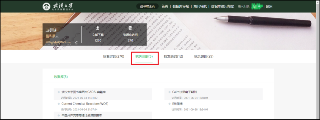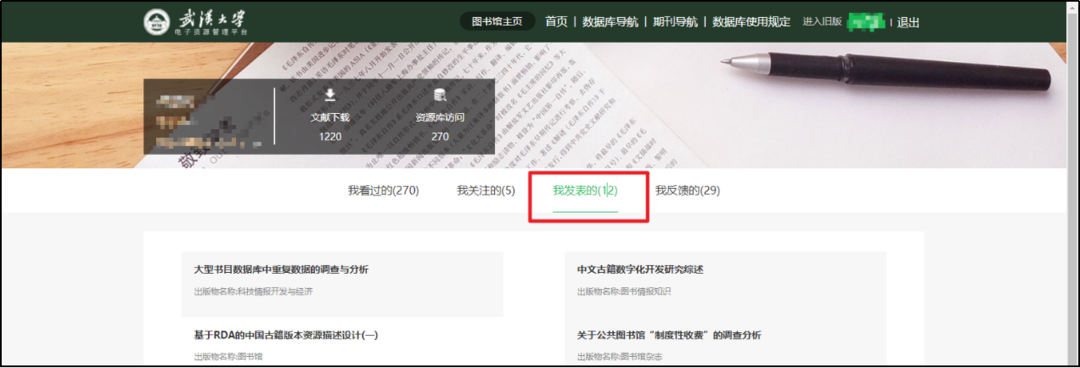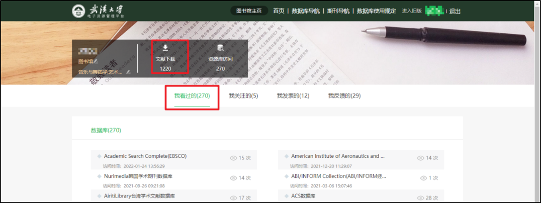 个人中心提供读者使用情况信息,包括文献下载量、看过的数据库、关注的数据库以及发表的文章。