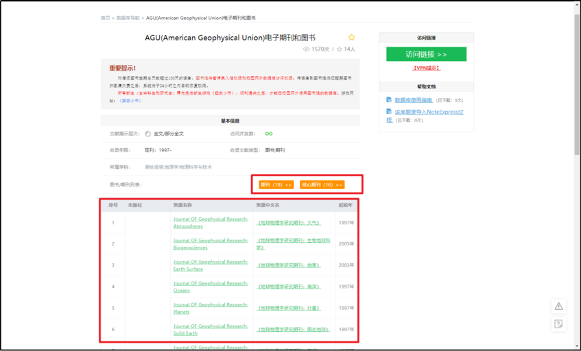 在数据库详情页,读者可以一键快速访问期刊。点击下方“期刊”或“核心期刊”,进入期刊列表。