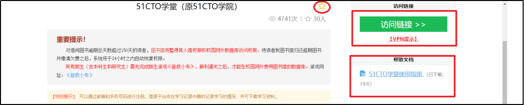 点击一个数据库,进入数据库详情页。博采系统提供数据库基础信息、访问链接、使用帮助等内容。点击右上角五角星,即可关注数据库。
