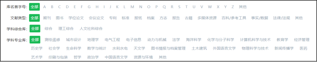同时提供数据库分面过滤,支持按首字母A-Z、文献类型、学科分类检索,快速筛选出所需数据库,满足读者不同的搜索习惯。