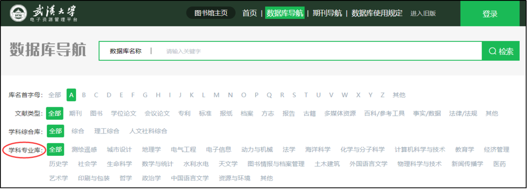 查找方法:打开图书馆主页,点击“数据库”链接,进入数据库导航,在下图“学科专业库”可以查到武汉大学几乎所有学科的常用专业库。