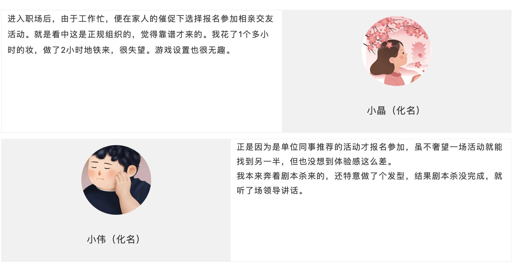 此前,某单位组织的一项以剧本杀为主题的相亲交友活动,场面极度尴尬,参加活动的青年人更是发出“白做了2小时地铁”的评价。