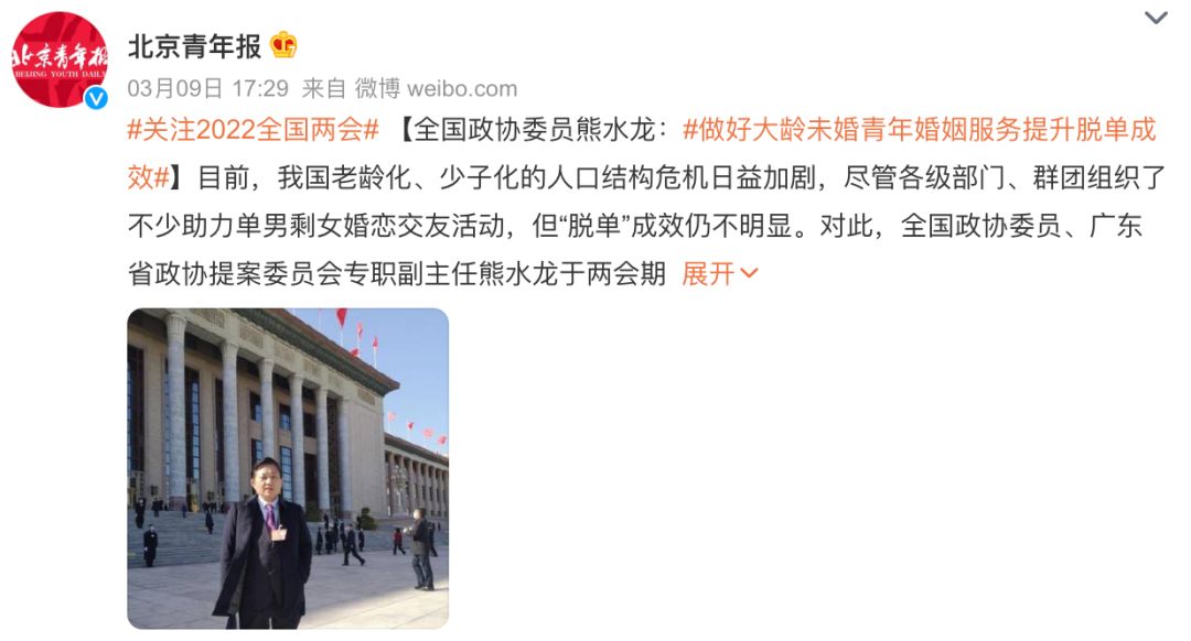 例如,全国政协委员、广东省政协提案委员会专职副主任熊水龙于两会期间提交《关于加强大龄未婚人员婚恋服务工作力度的建议》的提案: