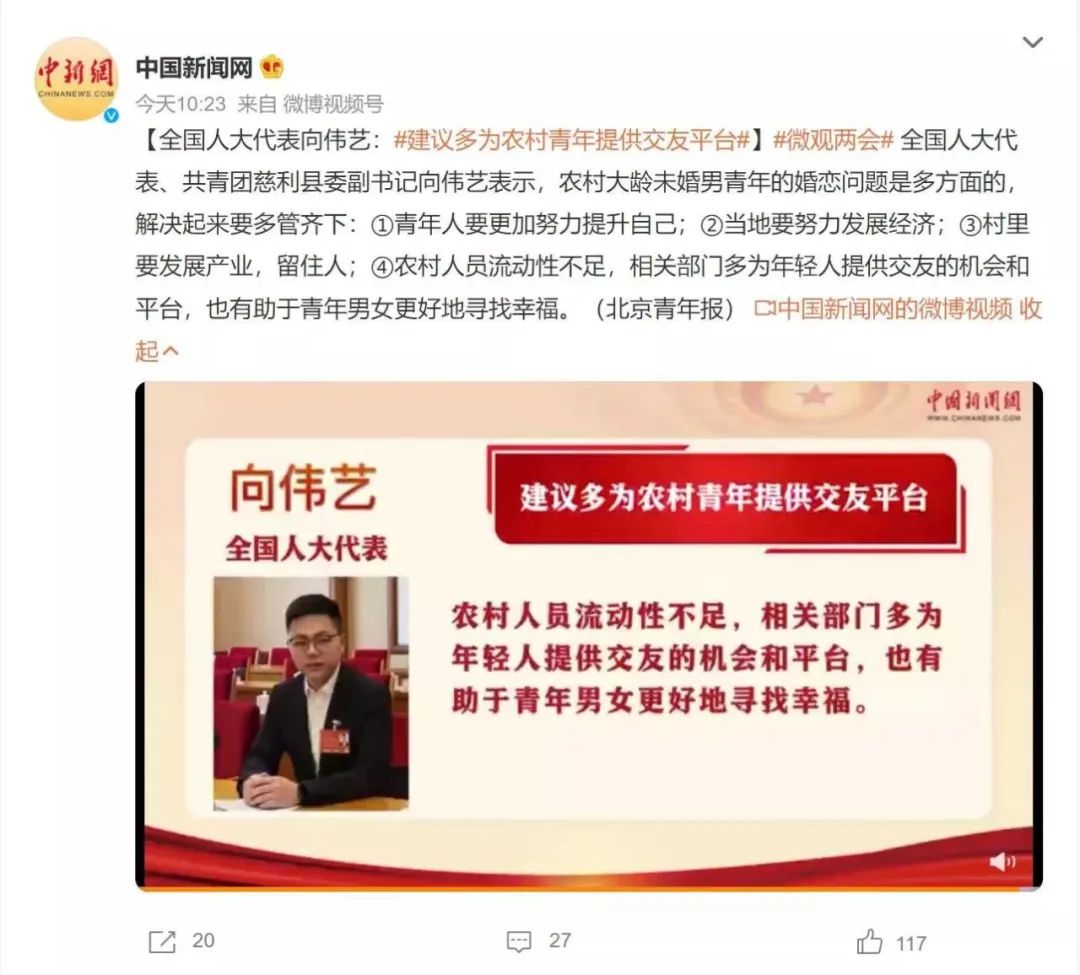 再如,全国人大代表、共青团慈利县委副书记向伟艺关注农村大龄未婚男青年的婚恋问题: