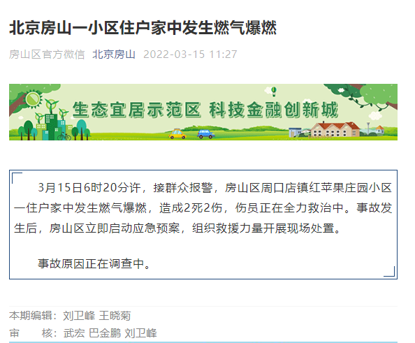 3月15日6时20分许,接群众报警,北京市房山区周口店镇红苹果庄园小区一住户家中发生燃气爆燃,造成2死2伤,伤员正在全力救治中。事故发生后,房山区立即启动应急预案,组织救援力量开展现场处置。